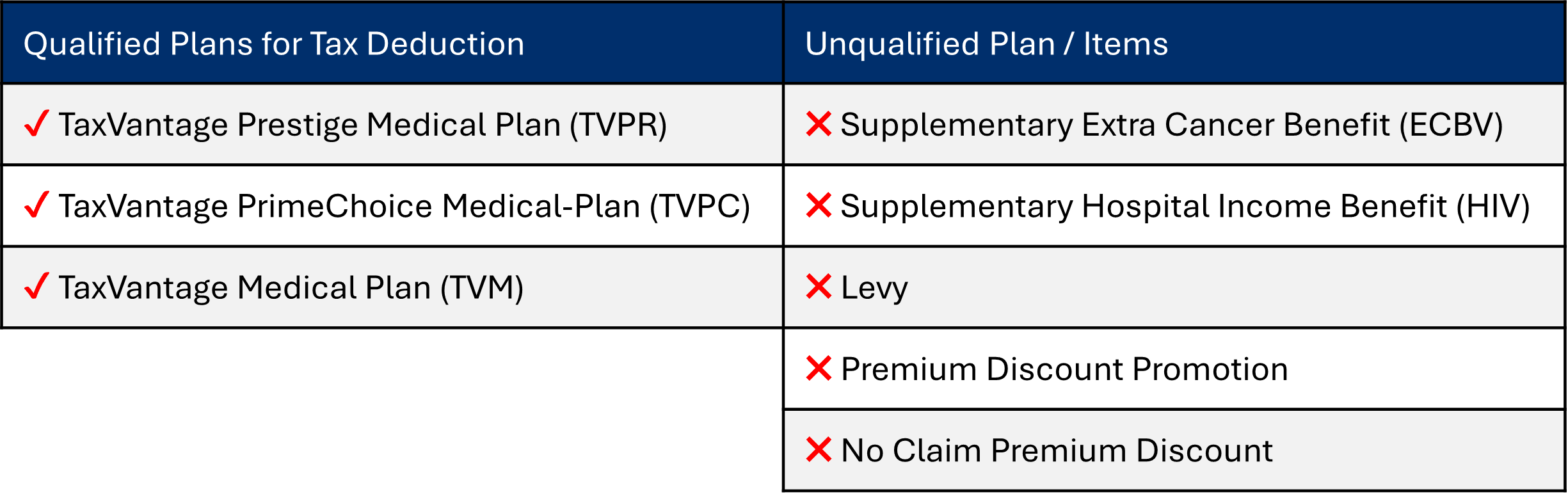 Premiums paid by a Hong Kong citizen for himself/herself and his/her specified dependant(s) for TaxVantage Prestige Medical Plan, TaxVantage PrimeChoice Medical Plan and/or TaxVantage Medical Plan on or after April 1, 2019 are qualified for a tax deduction. Premiums paid can be claimed for tax deduction up to HK$8,000 per Insured Person per year. For details of the tax deduction arrangement and illustrative examples, please refer to the website of VHIS at https://www.vhis.gov.hk/en/consumer_corner/tax-deduction.html and the website of the Inland Revenue Department.