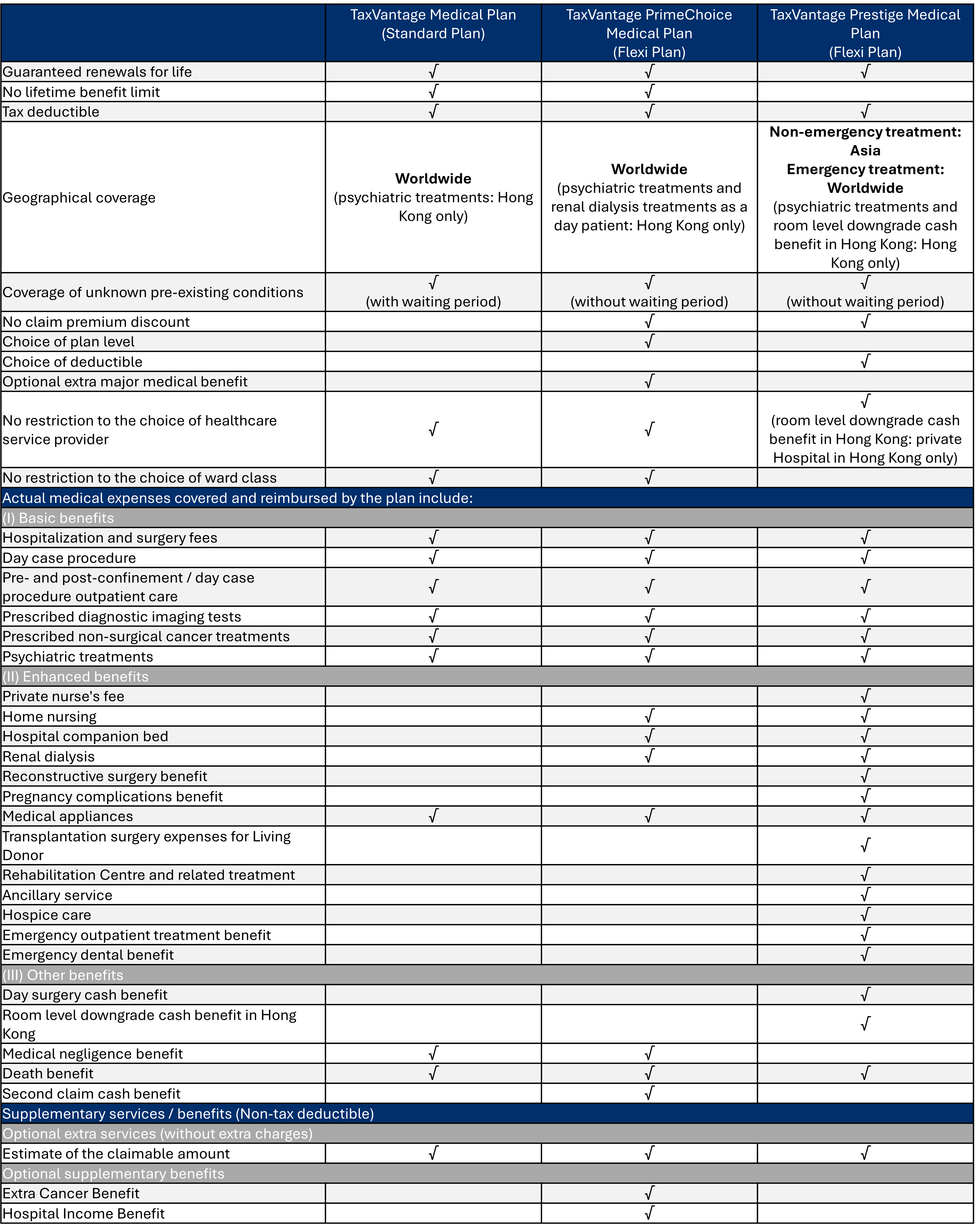 TaxVantage Medical Plan is a Standard Plan while TaxVantage PrimeChoice Medical Plan and TaxVantage Prestige Medical Plan are Flexi Plans under the Voluntary Health Insurance Scheme (VHIS) implemented by the government of the HKSAR. The coverage under the VHIS Standard Plan includes basic protection; while the Flexi Plan provides enhanced protection, e.g. higher benefit amount, extra medical coverage and a variety of product choices. Details are as follows:
