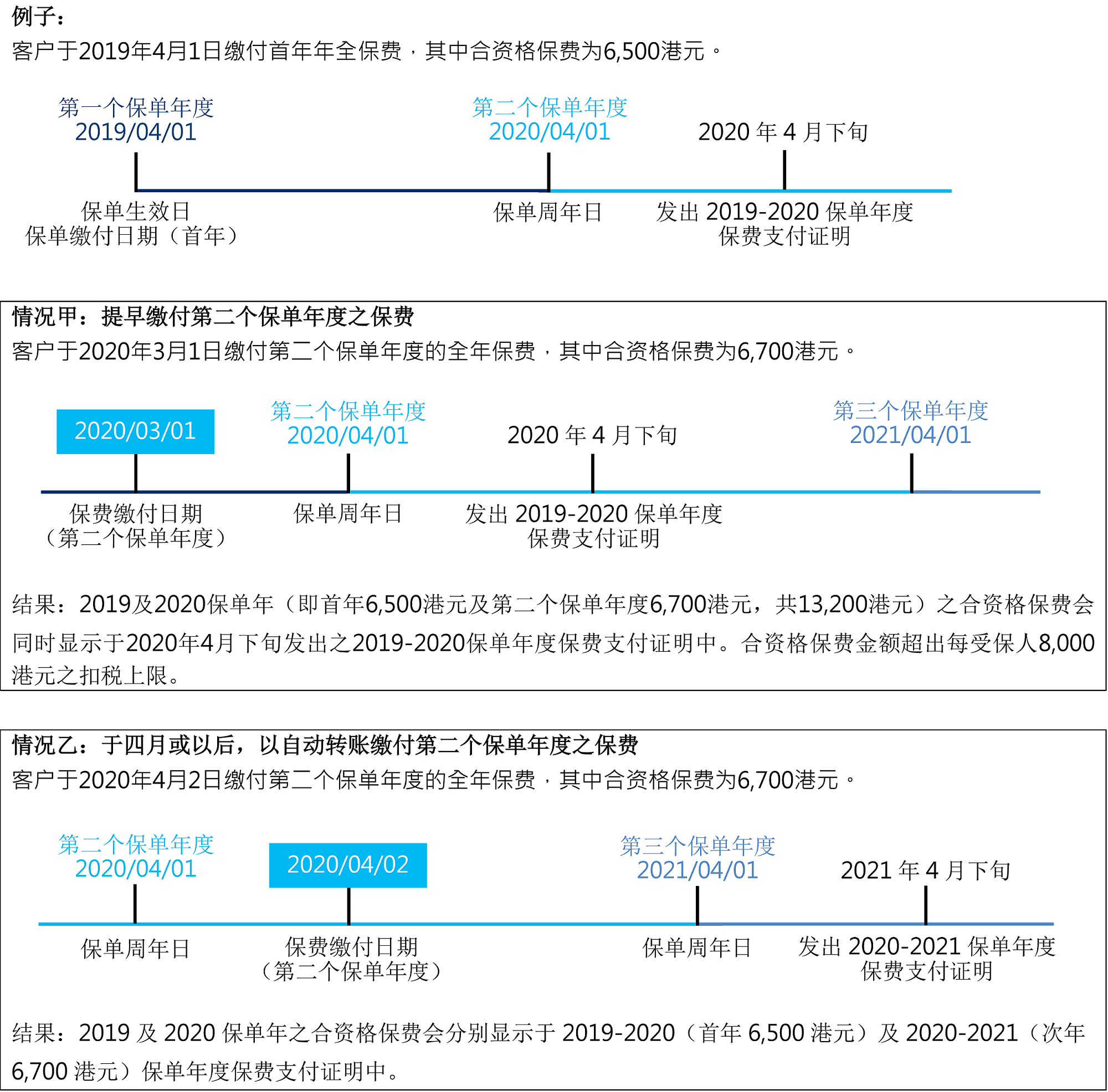 由于该合资格保费在2020年3月1日(即2019/2020课税年度)缴付,而非于2020/2021课税年度缴付,你可在2019/2020课税年度申请税务扣除。如欲于2020/2021课税年度申请税务扣除,则需于该课税年度内缴付保费(即2020年4月1日或以后)。