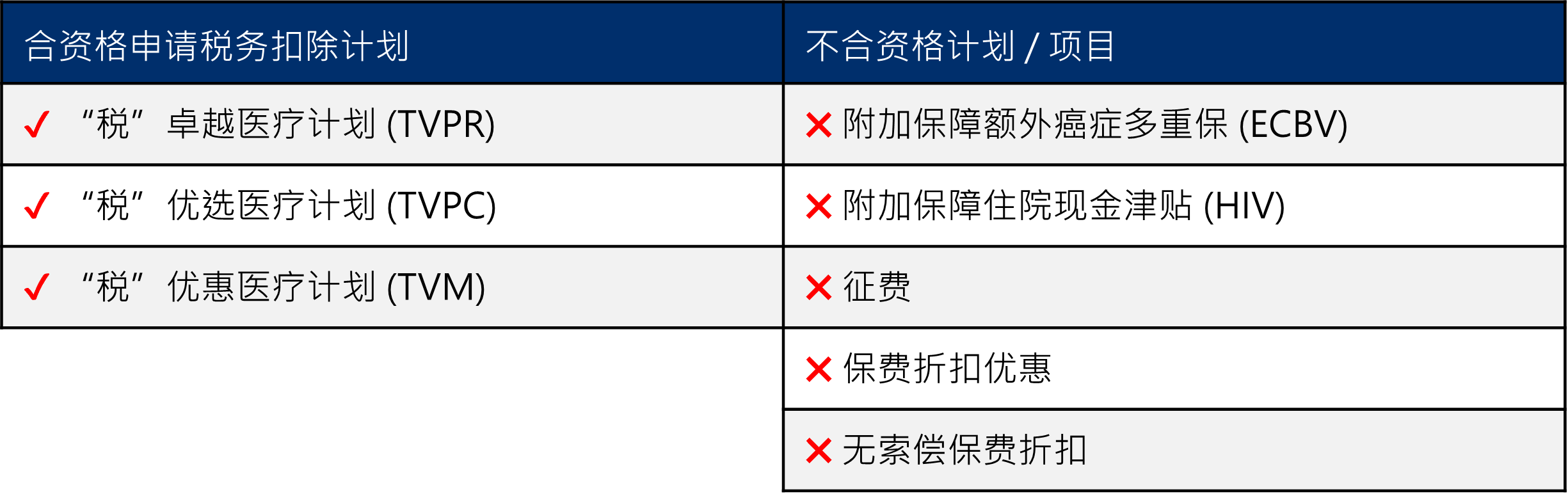 自愿医保计划合资格保费之详细定义可参阅香港法例税务条例第112章。按此税务条例,自愿医保计划的保单持有人于每个课税年度内所缴付自愿医保计划之净保费(即扣除附加保障保费、保费征费及保费折扣后之金额),均视为合资格保费,公司会发出保费支付证明,以作税务扣除证明之用。