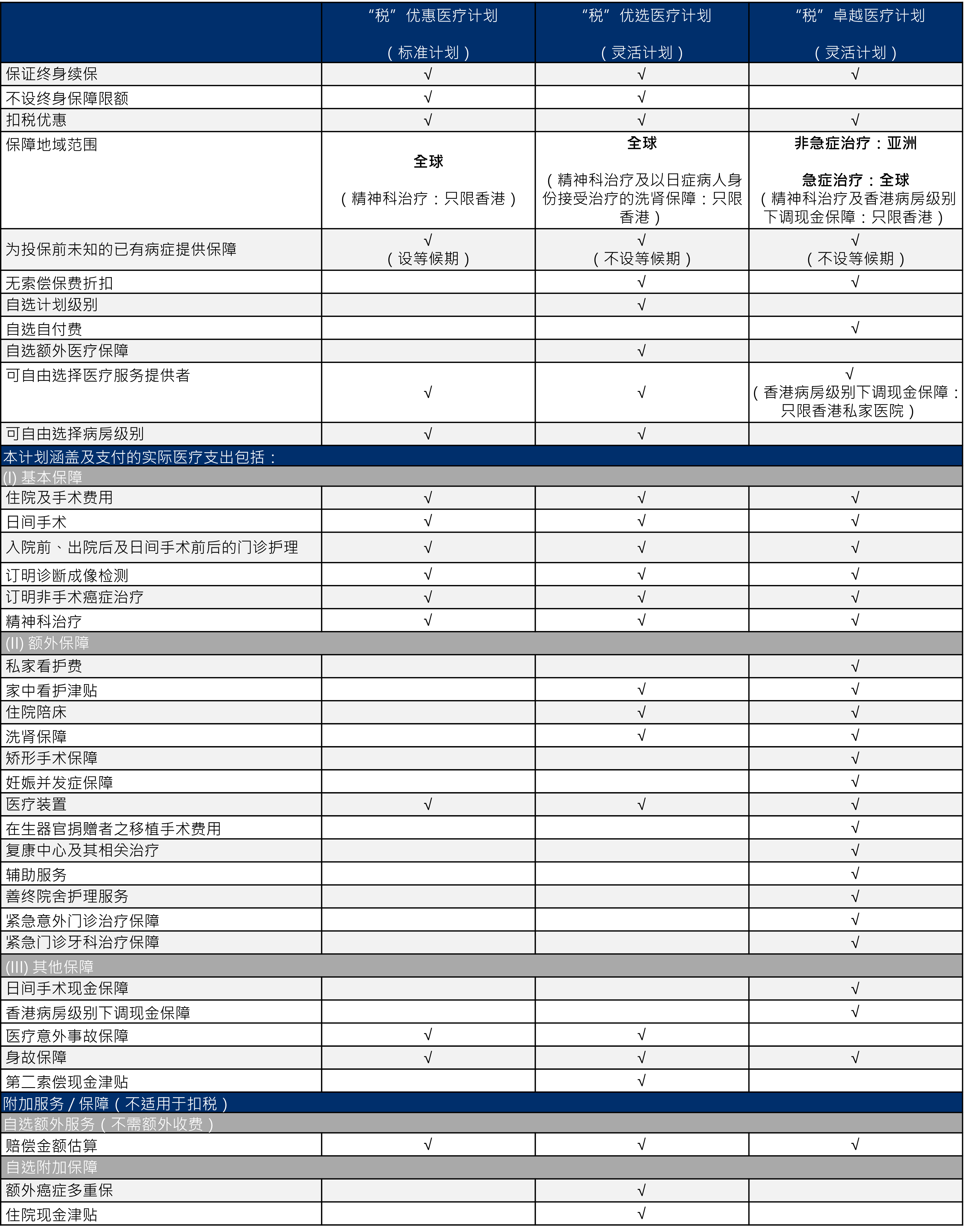 我们备有“税”卓越医疗计划(灵活计划)、 “税”优选医疗计划(灵活计划)及 “税优惠医疗计划(标准计划)以供选择。
